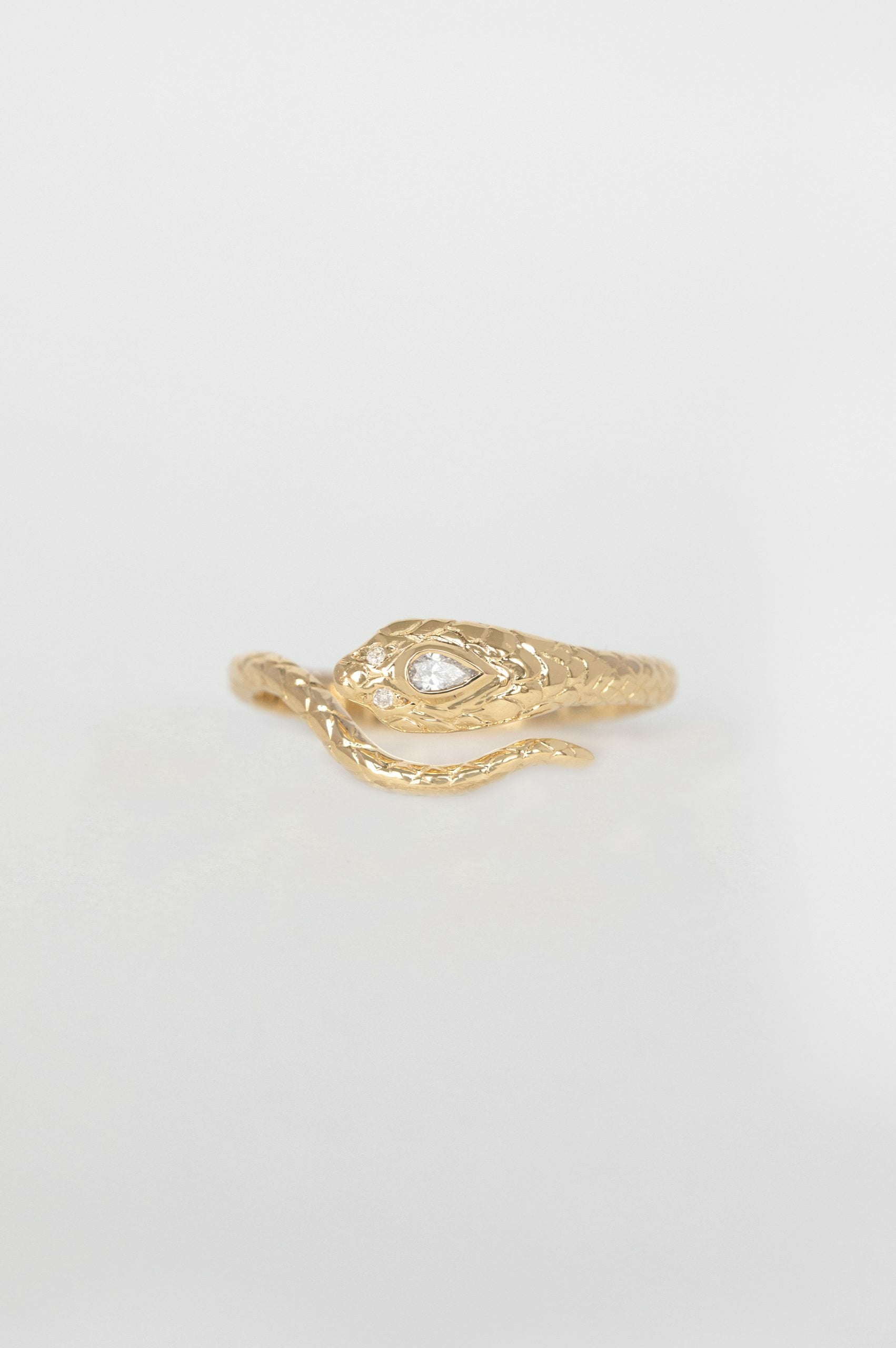 Celine Daoust 14k light yellow gold cobra ring with three diamonds.