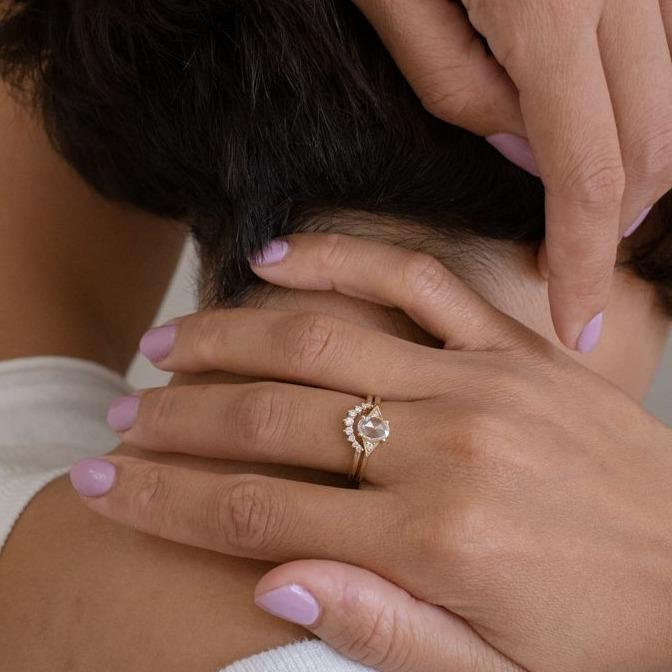 A touch of ice queen to top off your stack, this delicate beauty is pretty enough to work on her own as well. Although arched, the silhouette is graceful and avoids the awkwardness of some curved bands.