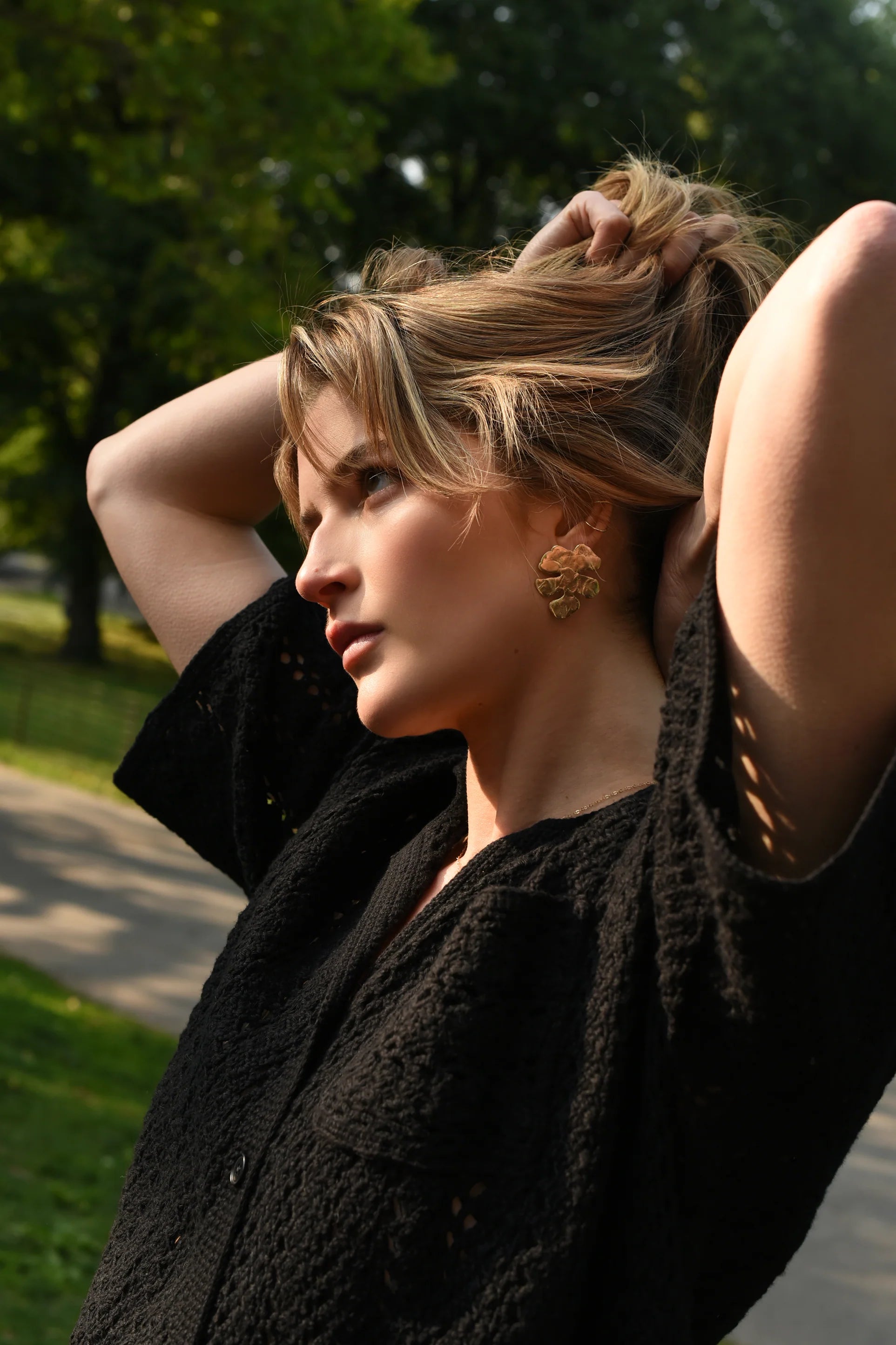 Brass, bronze, and sterling silver are solid metals that can oxidize over time. The slight hue can be removed by cleaning the piece. Refrain from polishing or abrasives to maintain the brushed finish of the metal.