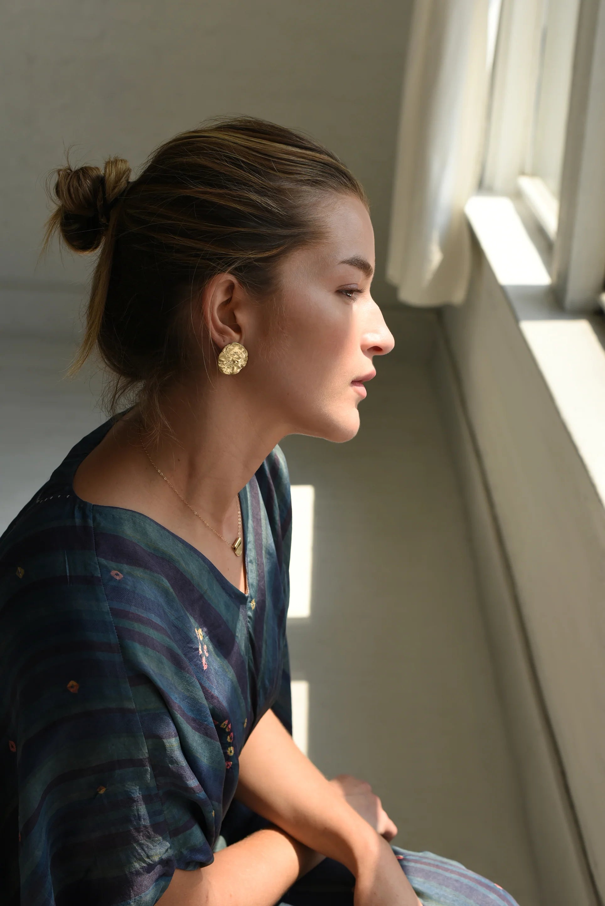 Brass, bronze, and sterling silver are solid metals that can oxidize over time. The slight hue can be removed by cleaning the piece. Refrain from polishing or abrasives to maintain the brushed finish of the metal.