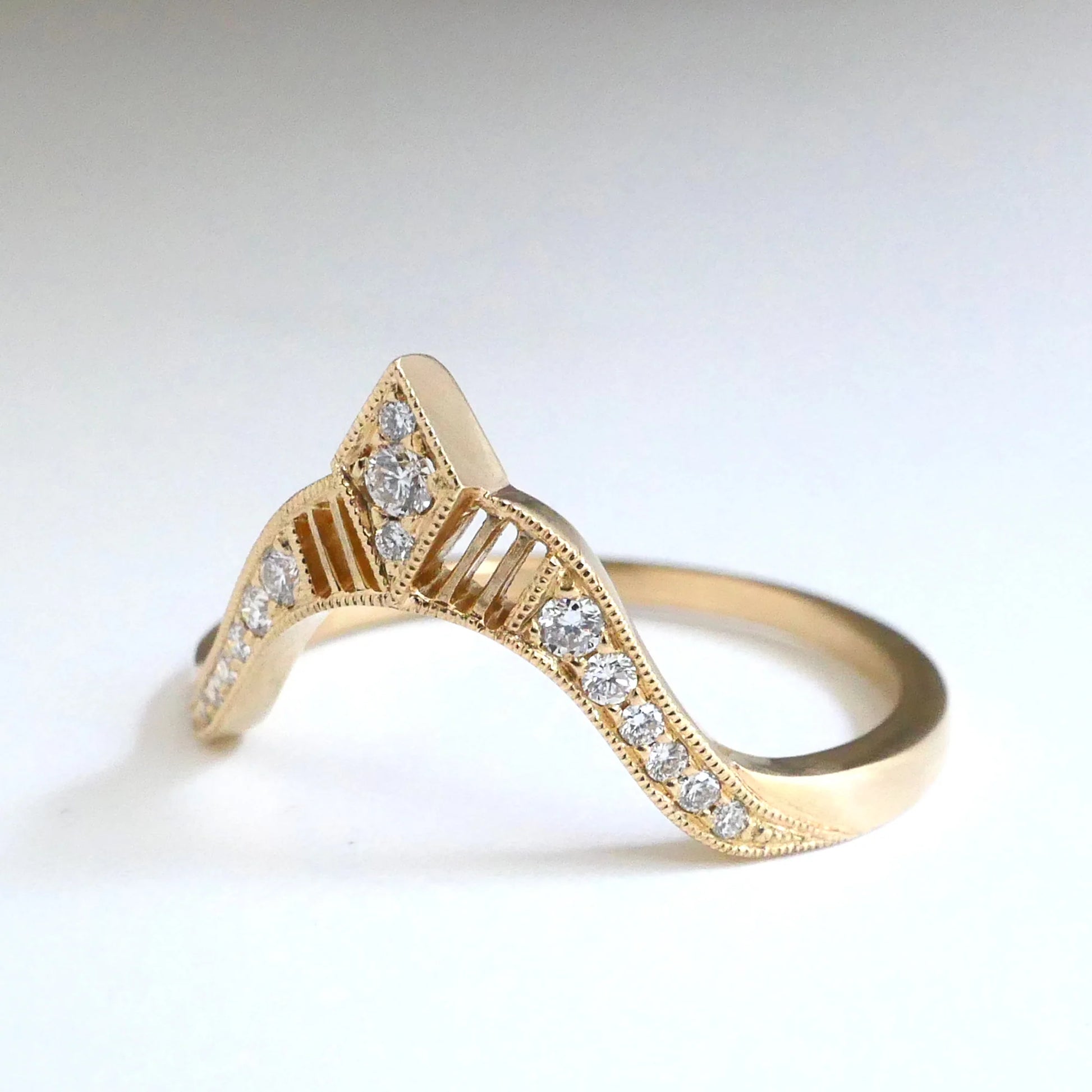 A graceful deep arch makes the Emma Ring a perfect choice for various setting with elongated center stones. Bead and bright cut set diamonds at sides and center accented with milgrain edge gives a refined and antique inspired look.
