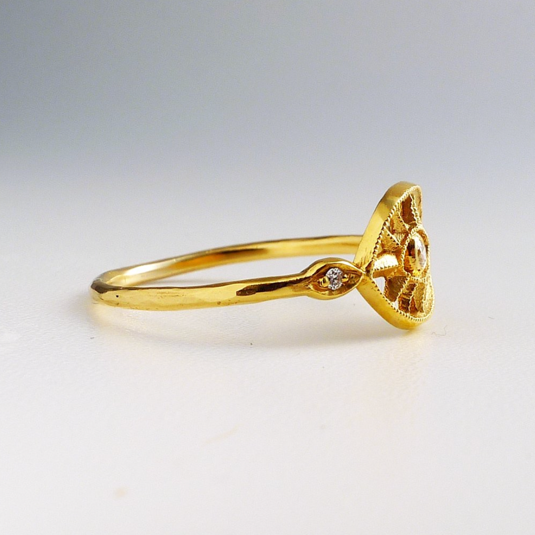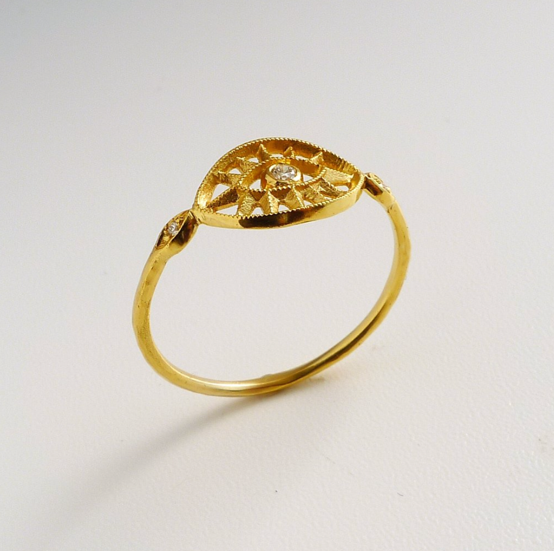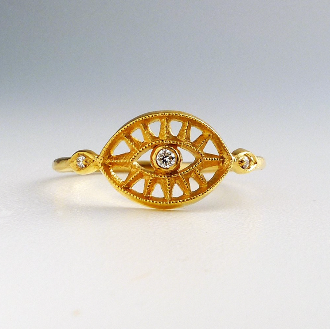 A small beholder of awakened consciousness. The eye ray ring honors its symbolic power in style and conception. Akin to ancient coins, the top portion has been relief carved to accentuate its timeless nature.