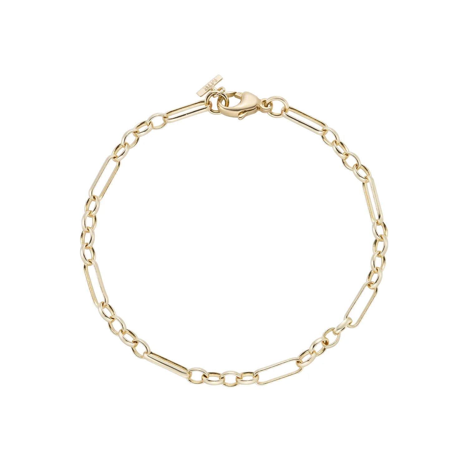 Eiffel Heavy Chain Bracelet is the perfect layering chain. It is adjustable from 7 through to 7.5 inches. Made from 9ct yellow gold, it features alternating oval and a trio of round curb links, which make the bracelet very smooth to the touch. The chain looks great with any of the plaques attached.