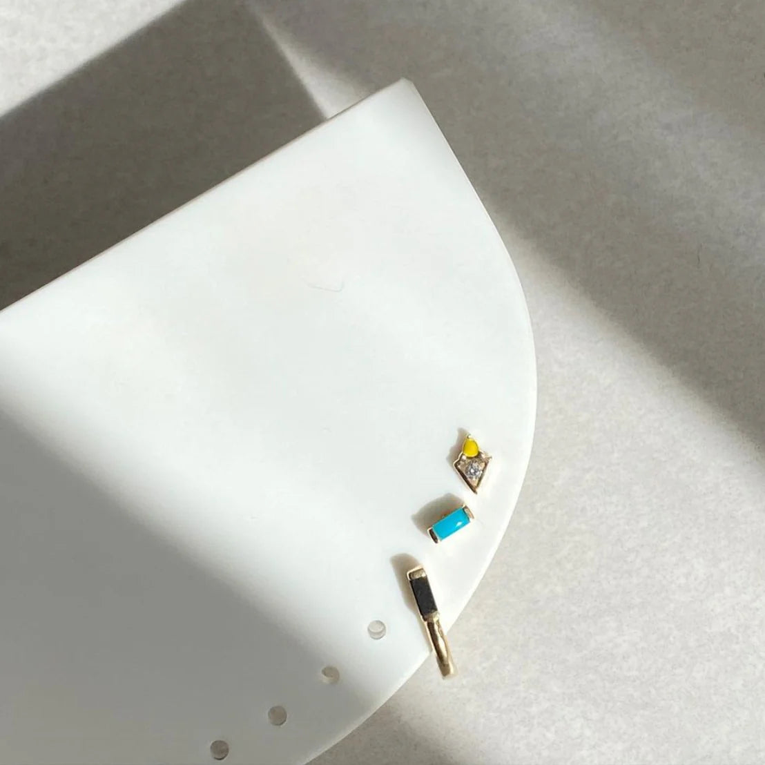 The Mini Claw Set Baguette Gemstone Stud is a part of Métier's Core collection. This mini stud is Claw or Channel set, the gemstone is surrounded in 9ct yellow gold, and is a timeless addition to your ear story. Available in butterfly/friction backing.