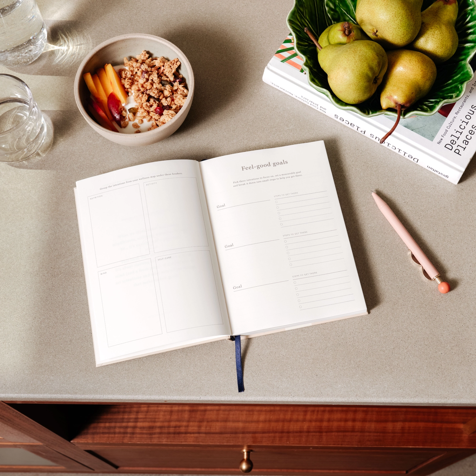 - 12 weeks worth of daily overview pages (two-page spread for each day), with space for logging intentions, sleep and energy levels in the morning and evening