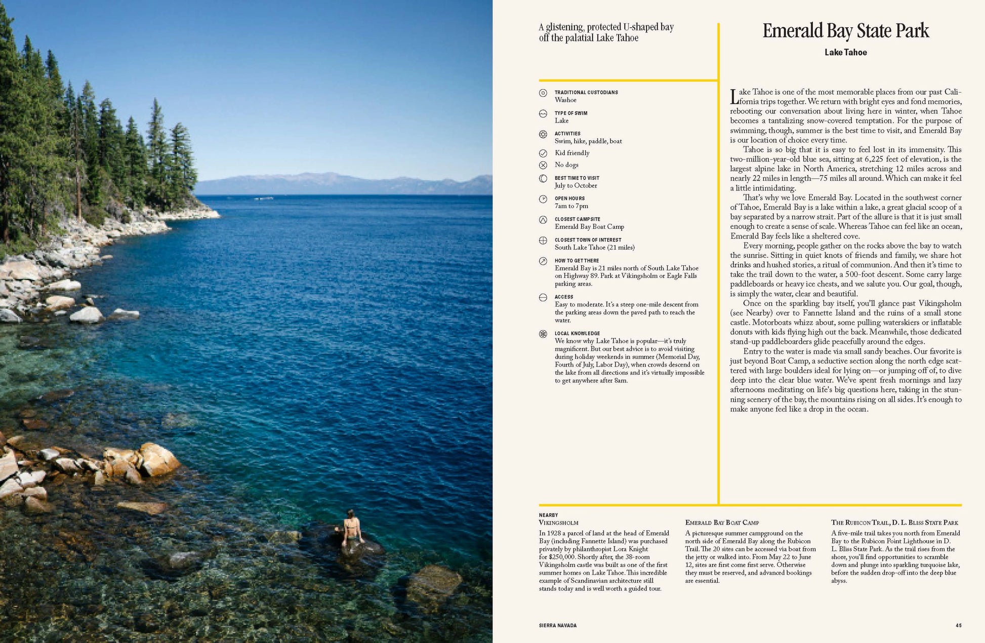 This beautiful book is divided into six distinct regions (Northern California, Sierra Nevada, Gold Country, Central California, Southern California, and The Bay Area) and covers more than 60 swimming locations, from river beaches in Mendocino to mountain lakes in Yosemite Valley, hot springs near Bishop and beaches on the south coast in San Diego. There's also a selection of road trip itineraries that combine favorite swimming spots with other pit stops along the way.
