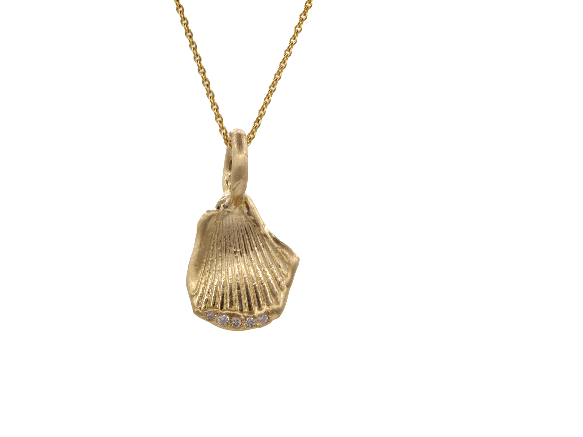 Like fragments of shells, an ode to the ocean to wear around your neck. Hand-formed using impressions from collected seashells, cast into solid gold and accented with white diamonds.