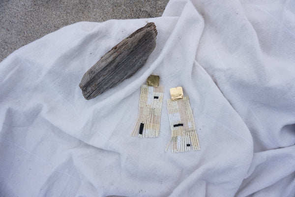 All beaded earrings are hand sewn with a needle and thread. Made with freshwater seed bead pearls and hand carved lost-wax casting in recycled brass with 24k gold plating.