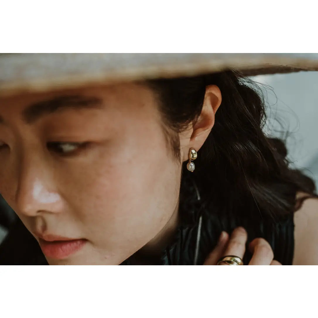 First carved from wax then cast in recycled bronze with sterling silver posts and backs. The Surya studs are a refined but elegant statement stud with beautiful fresh water pearls. They measure 1" long by .25" wide.