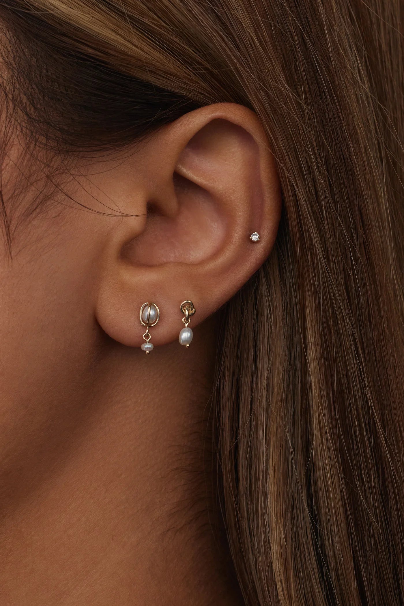 An intimate stud with a sweep of gold unfolding into a delicate pearl charm with a soothing sway.